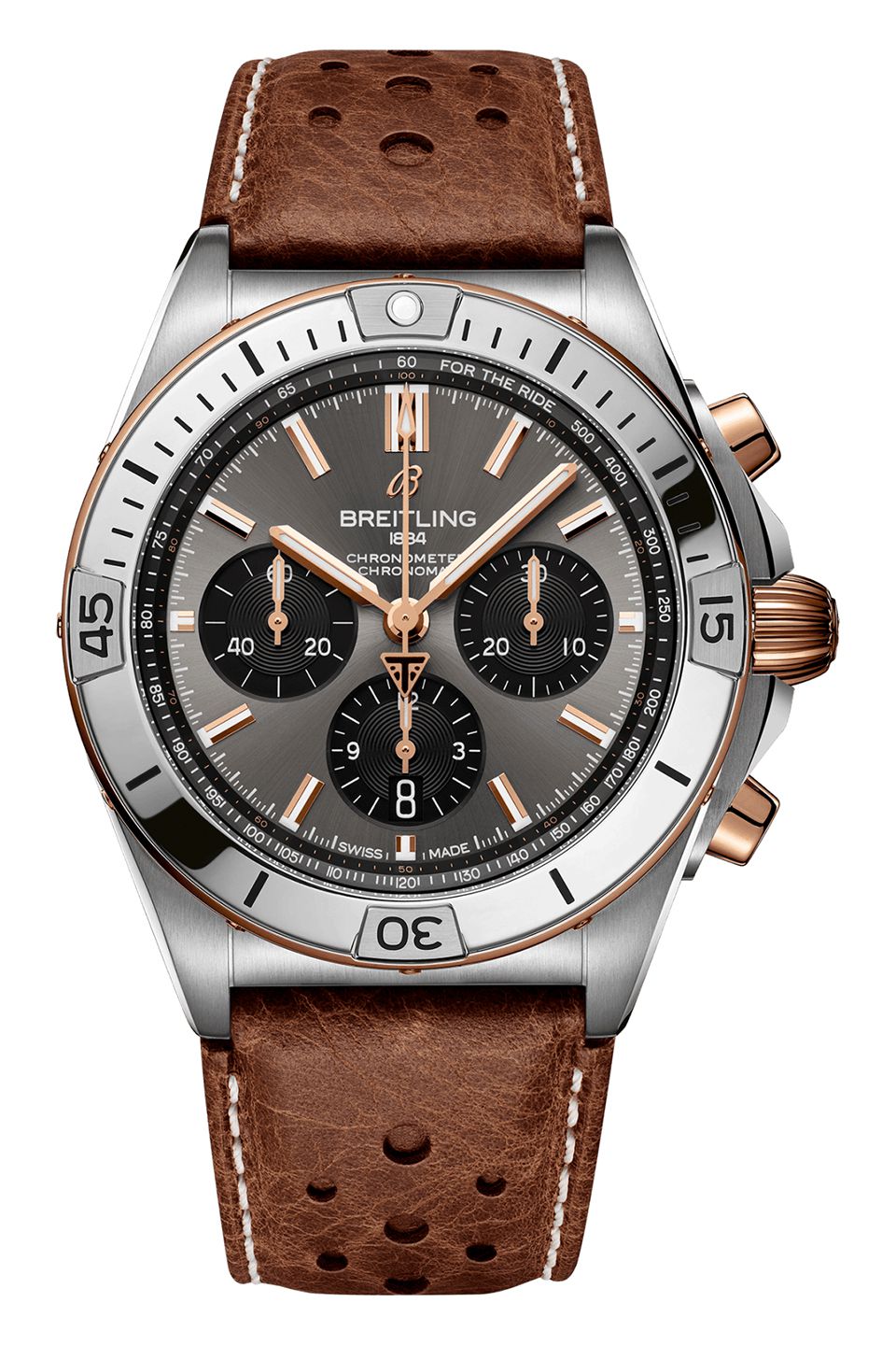 Všestranný model Chronomat od Breitlingu, vytvořený ve spolupráci s britskou motocyklovou značkou Triumph. Chronomat zaujímá významné místo v historii Breitlingu. Byl představen v roce 1984, v době, kdy byly na denním pořádku extra tenké quartzové hodinky, a Breitling se odvážně vsadil na mechanické hodinky s působivými proporcemi. Oslavila tak stylově sté výročí značky Breitling a znamenala návrat mechanického chronografu na jeho právoplatné prominentní místo u značky, která si na těchto neuvěřitelných hodinkách vybudovala svou celosvětovou reputaci. Chronomat B01 42 Triumph, který je stejně úchvatný na pohled jako vzrušující na nošení, přichází v nejvyšší specifikaci vůbec s rámem z titanu a 18karátového červeného zlata. Stejnou prémiovou kvalitu najdete i u limitované edice motocyklů Breitling Speed Triple RR od společnosti Triumph. Těchto moderních roadsterů bude vyrobeno pouze 270 kusů. Všimněte si diskrétního loga Triumph na protizávaží centrální ručky chronografu, gravírování „Triumph Edition“ na zadní straně pouzdra a perforovaného řemínku z telecí kůže, které odrážejí detaily motocyklu. Pokud vás zajímá jak motocykl, tak hodinky, pak se do toho pusťte naplno. Když si zajistíte jeden z 270 roadsterů Speed Triple RR, budete mít možnost zakoupit Chronomat B01 42 Triumph owners’ edition: hodinky vyrobené na zakázku s karbonovým číselníkem, které jsou k dispozici pouze na Breitling.com s vašimi přihlašovacími údaji.