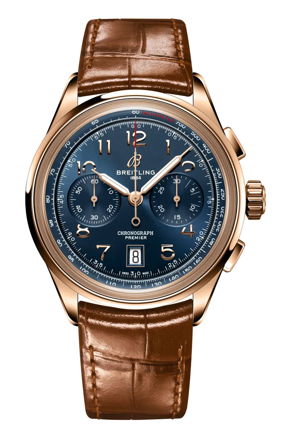 Model Premier Chronograph vzdává hold třem generacím inovátorů – Léonovi, Gastonovi a Willymu Breitlingovi – a ztělesňuje dědictví značky, která stála u zrodu moderního chronografu. Jak řekl Willy Breitling, Premier je „nezaměnitelnou známkou dokonalého vkusu“. Nejnovější generace hodinek Premier oživuje nadčasovou eleganci a představuje vrchol hodinářského umění značky Breitling prostřednictvím ikonických komplikací řady Premier, mezi něž patří Chronograph, Duograph a Datora. Charakteristickými prvky jsou obdélníkové tlačítka chronografu, bi-compax uspořádání ciferníku a arabské číslice, doplněné o jemné detaily inspirované historií – drážky na bocích pouzdra, průhledné safírové dýnko a ručky ve vintage stylu. Model Chronograph je dostupný ve dvou variantách: z nerezové oceli s pistáciově zeleným ciferníkem a hnědým aligátořím řemínkem, nebo z 18k červeného zlata se stříbrným ciferníkem a hnědým aligátořím řemínkem. Pohon zajišťuje ručně natahovaný, COSC certifikovaný manufakturní kalibr Breitling B09.