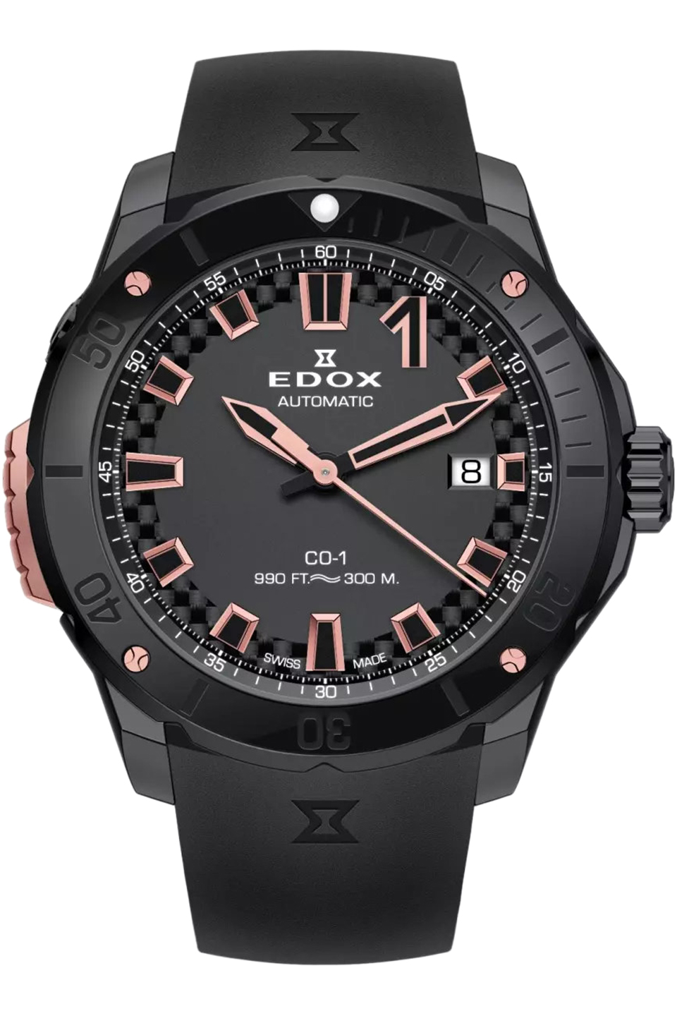 Nový přírůstek do modelové řady CO-1, která je od jakživa spojena s potápěním a také se závodními motorovými čluny třídy CO1. Jedná se o model Date Automatic. Srdcem hodinek je mechanický strojek s automatickým nátahem od švýcarského výrobce Sellita SW200 s rezervou chodu 38h. Pouzdro hodinek je vyrobeno z chirurgické oceli 316L se silnou PVD povrchovou úpravou v šedé barvě a má průměr příjemných 42mm. Výška pouzdra je 11,9mm. Ikonickým prvkem této řady je otočná keramická luneta, kterou můžete u tohoto modelu uzamknout díky charakteristickému systému "Bezel Lock" v barvě růžového zlata, krásně tak ladí s barvou ruček, indexů a šroubků na keramické lunetě. Hodinky mají silné safírové sklo. Voděodolnost tohoto modelu je 30 ATM/300m. Černý číselník s karbonovým vzorem mezi idnexy po vnitřním obvodu číselníku. Na indexech a ručkách je nanesena směr Super-Luminova Grade X1, která se vyznačuje silnější luminiscencí a lepší čitelností. Hodinky mají šroubovací korunku pro zajištění maximální vodotěsnosti a prachotěsnosti, což je typické pro potápěčské a sportovní modely. Dalším prvkem je automatický heliový ventil - je to bezpečnostní mechanismus, který automaticky uvolňuje přetlak helia, jež vniklo do pouzdra během pobytu v hlubinách, čímž zabraňuje poškození sklíčka při výstupu; funguje na principu rozdílu tlaku, kdy se ventil sám pootevře, jakmile okolní tlak klesne a vnitřní tlak hodinek je vyšší, což je klíčové pro saturační potápěče. Hodinky mají černý kaučukový řemínek s bezpečnostní překlapávací sponou.