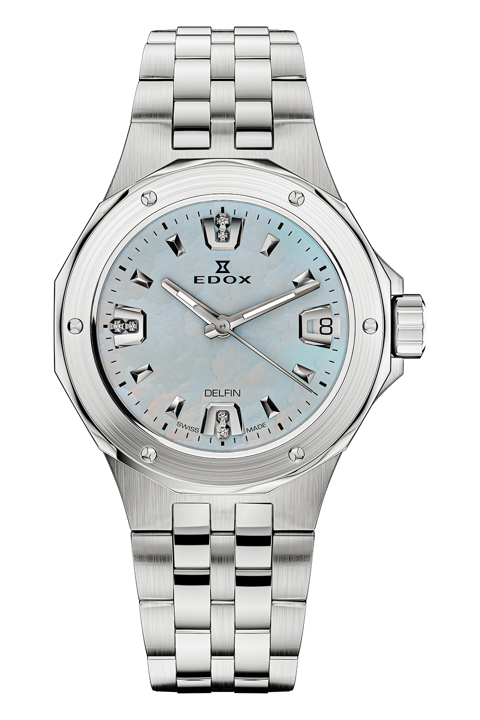 Nový model Diver Date Lady 33 od švýcarského výrobce hodinek Edox vnáší do legendární řady Delfin rafinovaný nádech. Díky kompaktnějšímu pouzdru(s diametrem 33mm) a nově navržené lunetě, nabízí tato edice elegantnější a uhlazenější design, aniž by tím utrpělo DNA této modelové řady. O přesný chod hodinek se stará švýcarský quartzový strojek RONDA 515. Hodinky mají vysokou voděodolnost 20ATM(200m) - jsou tedy vhodné jak na plavání tak i na potápění bez přístroje. Safírové sklo je samozřejmostí. Dále mají třpytivý perleťový číselník osázen pravými diamanty, které dodávají hodinkám jemný nádech luxusu. Tento model Delfin, který je k dispozici výhradně s nerezovým ocelovým náramkem, je dokonalým společníkem pro sebevědomé ženy s chutí na dobrodružství a sofistikovanost.