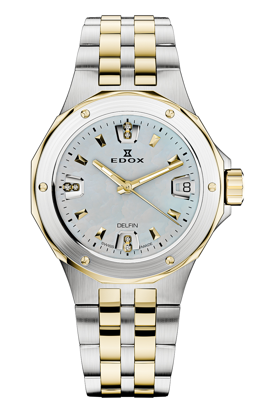 Nový model Diver Date Lady 33 od švýcarského výrobce hodinek Edox vnáší do legendární řady Delfin rafinovaný nádech. Díky kompaktnějšímu pouzdru(s diametrem 33mm) a nově navržené lunetě, nabízí tato edice elegantnější a uhlazenější design, aniž by tím utrpělo DNA této modelové řady. Pouzdro i náramek jsou vyrobeny z chirurgické oceli 316L s povrchovou PVD úpravou ve zlaté barvě. O přesný chod hodinek se stará švýcarský quartzový strojek RONDA 515. Hodinky mají vysokou voděodolnost 20ATM(200m) - jsou tedy vhodné jak na plavání tak i na potápění bez přístroje. Safírové sklo je samozřejmostí. Dále mají třpytivý perleťový číselník osázen pravými diamanty, které dodávají hodinkám jemný nádech luxusu. Ručky jsou potaženy luminescenční směsí Super Luminova X1. Tento model Delfin, který je k dispozici výhradně s nerezovým ocelovým náramkem, je dokonalým společníkem pro sebevědomé ženy s chutí na dobrodružství a sofistikovanost.