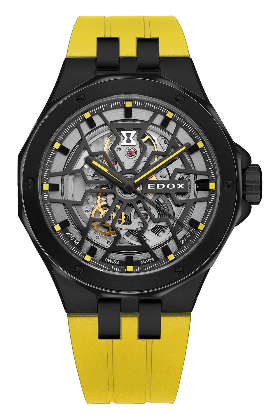 Model Mecano je novým přírůstkem v historicky úspěšné řadě Delfin, kterou značka Edox prodává již od 60 let. Tato řada se vyznačuje vysokou voděodolností, spolehlivostí, patentem dvojího těsnění korunky a specifickým designem 12ti hranné lunety, která je pro řadu Delfin ikonická již od jejího počátku. Model Mecano je vyroben z chirurgické oceli s PVD povrchovou úpravou v černé barvě. Jedná se o pánské mechanické hodinky s automatickým nátahem, rezerva chodu 42h, průměr pouzdra je 43mm, vysoká voděodolnost 20 ATM(200m), safírové sklo, černý skeletový číselník, ručky jsou vysoce luminiscenční díky nové směsi Super-luminova, transparentní zadní víko hodinek, patentovaná šroubovací korunka s dvojím těsněním, žlutý kaučukový řemínek s trnovou sponou, výška pouzdra hodinek je 12,5mm