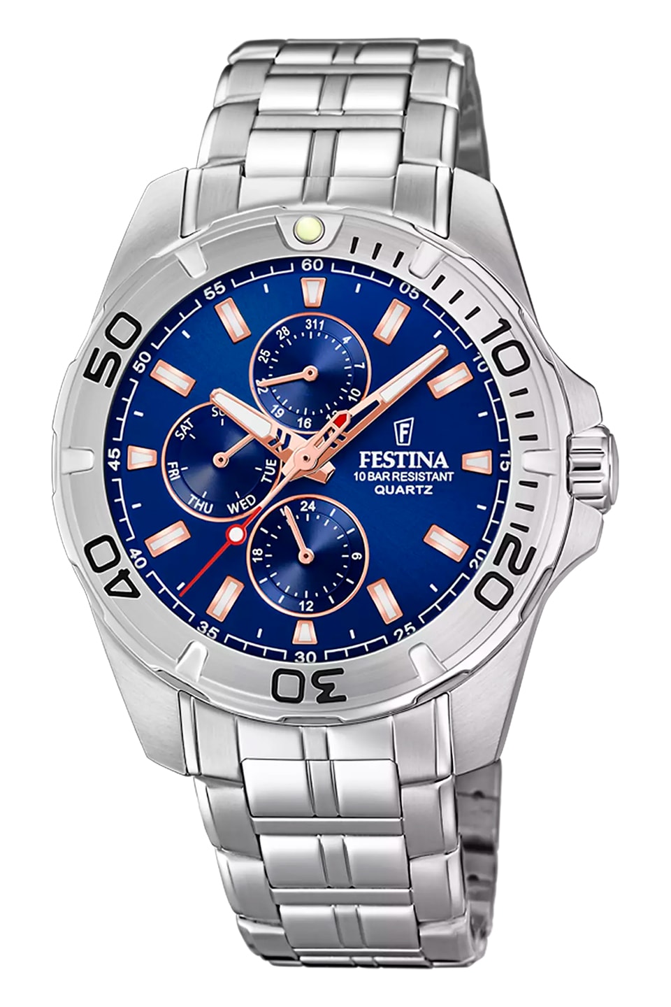 Hodinky Festina Multifunction jsou sportovnějšího vzhledu a namísto běžnějšího a používanějšího chronografu přináší uživatelům jiné praktičtější funkce. Každý model nabízí jinou možnost funkcí a nabídka zahrnuje funkce jako datum, den v týdnu, měsíc v roce, dvacetičtyřhodinový ukazatel a jiné. Celá kolekce je plná různých barevných variant číselníků, které mají vskutku moderní design. Modely jsou vyrobeny z nerezové ušlechtilé oceli a osazeny minerálním sklíčkem. Hodinky Festina Multifunction nabízí vysokou variabilitu, líbivé zpracování a spoustu zajímavých a praktických funkcí.
