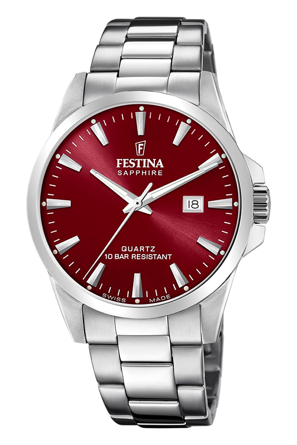 Pánské quartzové hodinky v celoocelovém provedení disponují datumovkou a vodotěsností 100 metrů. Červený číselník je chráněn safírovým sklem. (F20024/7)