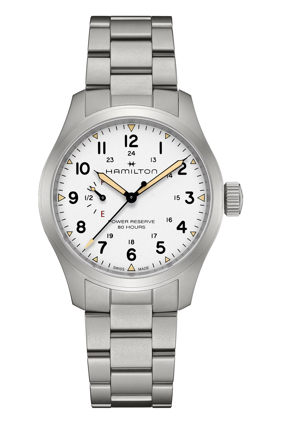 Hodinky Khaki Field Mechanical Power Reserve 40 mm ctí tradiční design a základní funkčnost rodiny Khaki a zároveň přinášejí moderní funkce a nejnovější hodinářské technologie a inovace. Nový strojek H-23 s ručním nátahem, vyvinutý společností ETA exkluzivně pro Hamilton, umožňuje (poprvé) zobrazit 80hodinovou rezervu chodu přímo na číselníku. Bílý číselník, opatřený kovovým náramkem z nerezové oceli, hrdě zobrazuje nápis "power reserve 80 hours" a ukazuje "F" pro plnou a "E" pro prázdnou rezervu, aby podtrhl tuto výjimečnou a na užitek zaměřenou funkci.