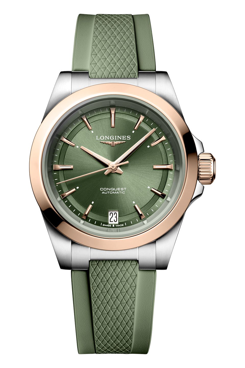 Hodinky Longines Conquest mají pouzdro o průměru 34 mm, tloušťce 10,90 mm a voděodolnosti do 100 m, které ukrývá švýcarský automatický strojek L888 s rezervou chodu až 72 hodin. Strojek má vlásek vyrobený z monokrystalického křemíku, jenž je rezistentní vůči magnetickým polím. Pouzdro je vyrobené z nerezové oceli doplňuje luneta s růžově zlatým povrchem (Gold Cap 200 mikronů). Přehledný zelený číselník s povrchovou úpravou imitující sluneční paprsky má datumovku na 6. hodině a je krytý safírovým sklíčkem s oboustrannou antireflexní vrstvou. Ručky i jednoduché indexy jsou v barvě růžového zlata a je na nich aplikována Super-LumiNova pro lepší čitelnost při obtížných světelných podmínkách. Vše doplňuje zelený kaučukový řemínek s překlápěcí sponou.