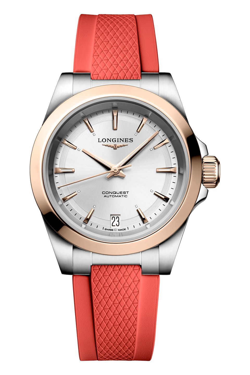 Hodinky Longines Conquest mají pouzdro o průměru 34 mm, tloušťce 10,90 mm a voděodolnosti do 100 m, které ukrývá švýcarský automatický strojek L888 s rezervou chodu až 72 hodin. Strojek má vlásek vyrobený z monokrystalického křemíku, jenž je rezistentní vůči magnetickým polím. Pouzdro je vyrobené z nerezové oceli doplňuje luneta s růžově zlatým povrchem (Gold Cap 200 mikronů). Přehledný stříbrný číselník s povrchovou úpravou imitující sluneční paprsky má datumovku na 6. hodině a je krytý safírovým sklíčkem s oboustrannou antireflexní vrstvou. Ručky i jednoduché indexy jsou v barvě růžového zlata a je na nich aplikována Super-LumiNova pro lepší čitelnost při obtížných světelných podmínkách. Vše doplňuje oranžový kaučukový řemínek s překlápěcí sponou.