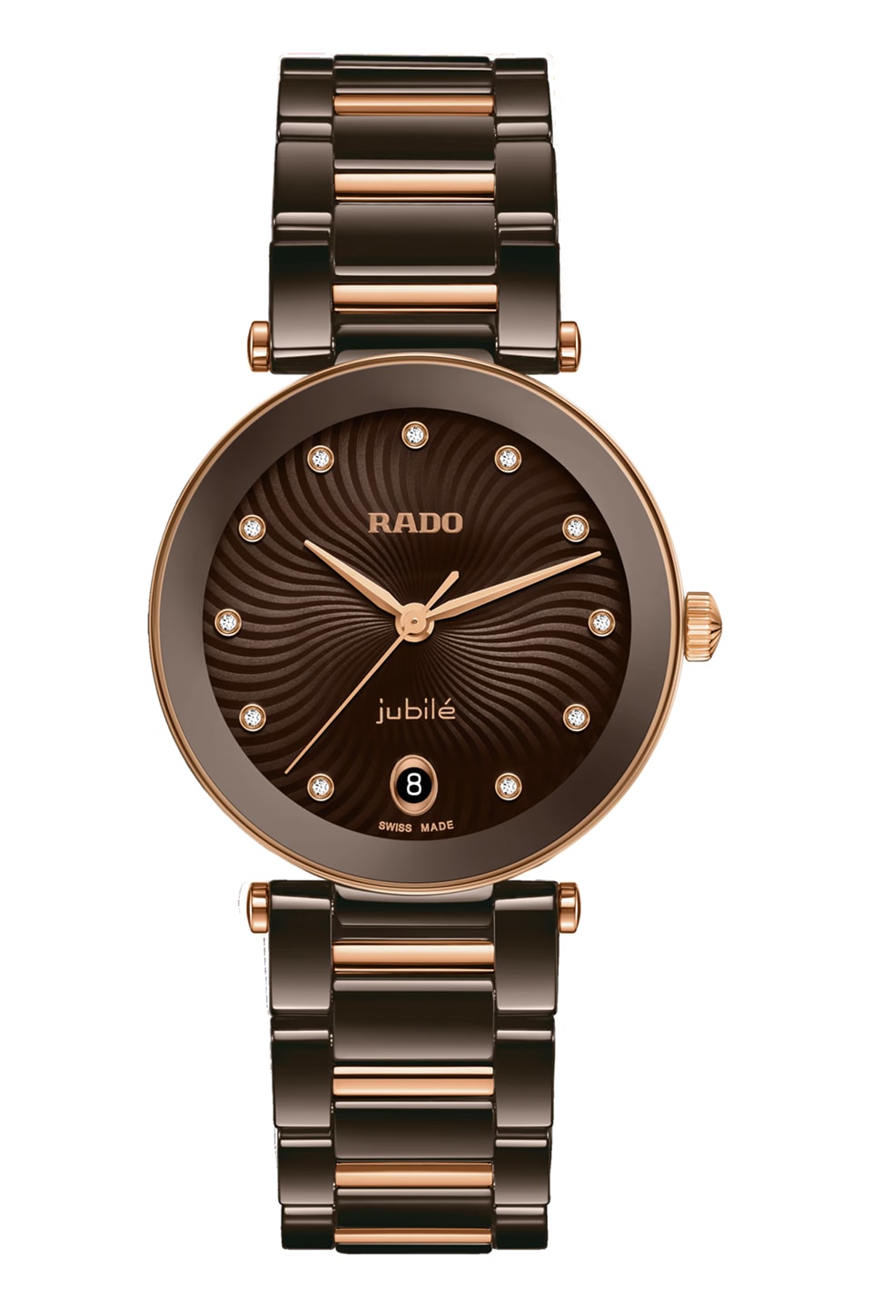 Hodinky zaujmou 31mm monoblokovým pouzdrem z leštěné hnědé high-tech keramiky, doplněným klenutým safírovým sklíčkem s hnědo–růžově zlatým metalizovaným okrajem. Odolnost 5 bar (50 m) zaručuje spolehlivost při každodenním nošení, aniž by ustoupila elegance ikonického designu Rado.