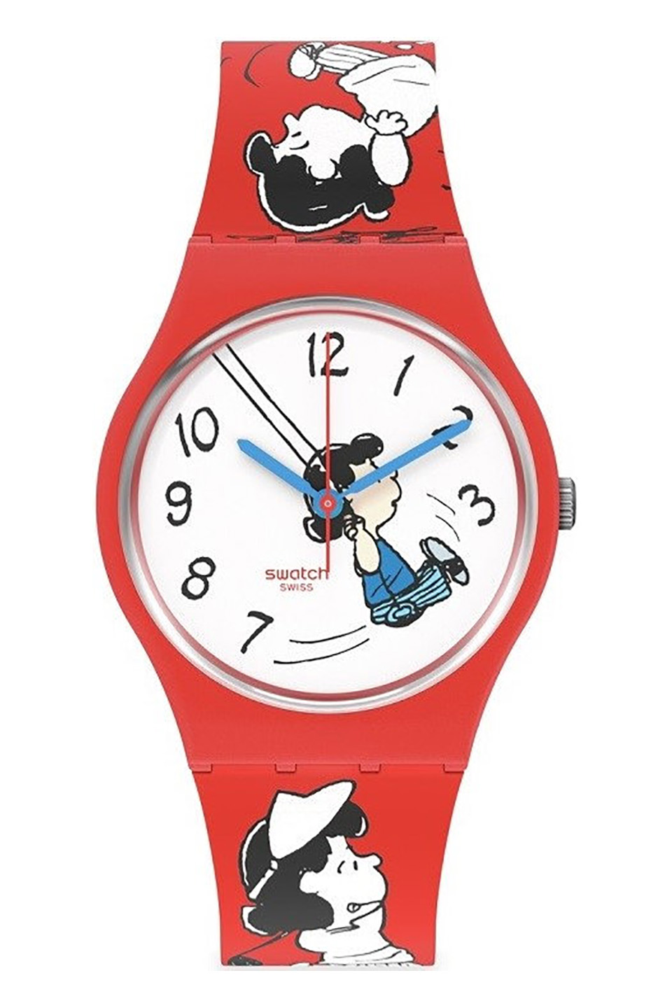 U těchto hodinek Swatch X Peanuts Lucy Van Pelt tvoří matný červený silikonový řemínek a pouzdro z biologického materiálu výrazný kontrast s černobílým potiskem Lucy na řemínku. Matná modrá silikonová smyčka s potiskem a matná modrá plastová spona dodávají těmto hodinkám Peanuts finální vzhled.