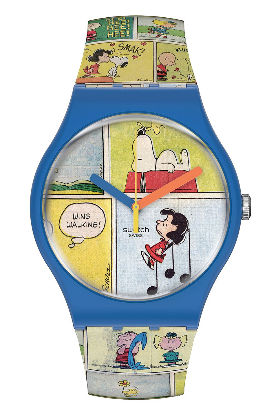 Pevné matné modré pouzdro z biologického materiálu a silikonový řemínek jsou dokonalým doplňkem pro pestrobarevný, složitý komiksový vzor na těchto hodinkách Swatch X Peanuts. Pevná matná modrá silikonová smyčka a plastová spona dodávají těmto komiksovým hodinkám Peanuts klasický, ale zároveň zábavný vzhled.