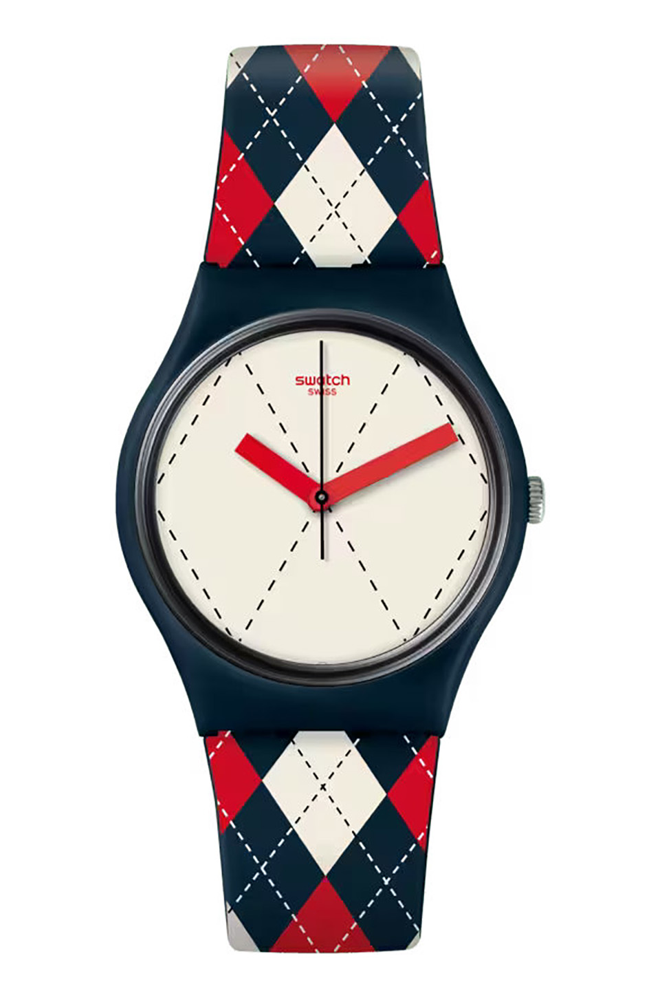 SOCQUETTE (GN255) vás ohromí výrazným argylovým vzorem červených a modrých kosočtverců a krémově bílým ciferníkem.
