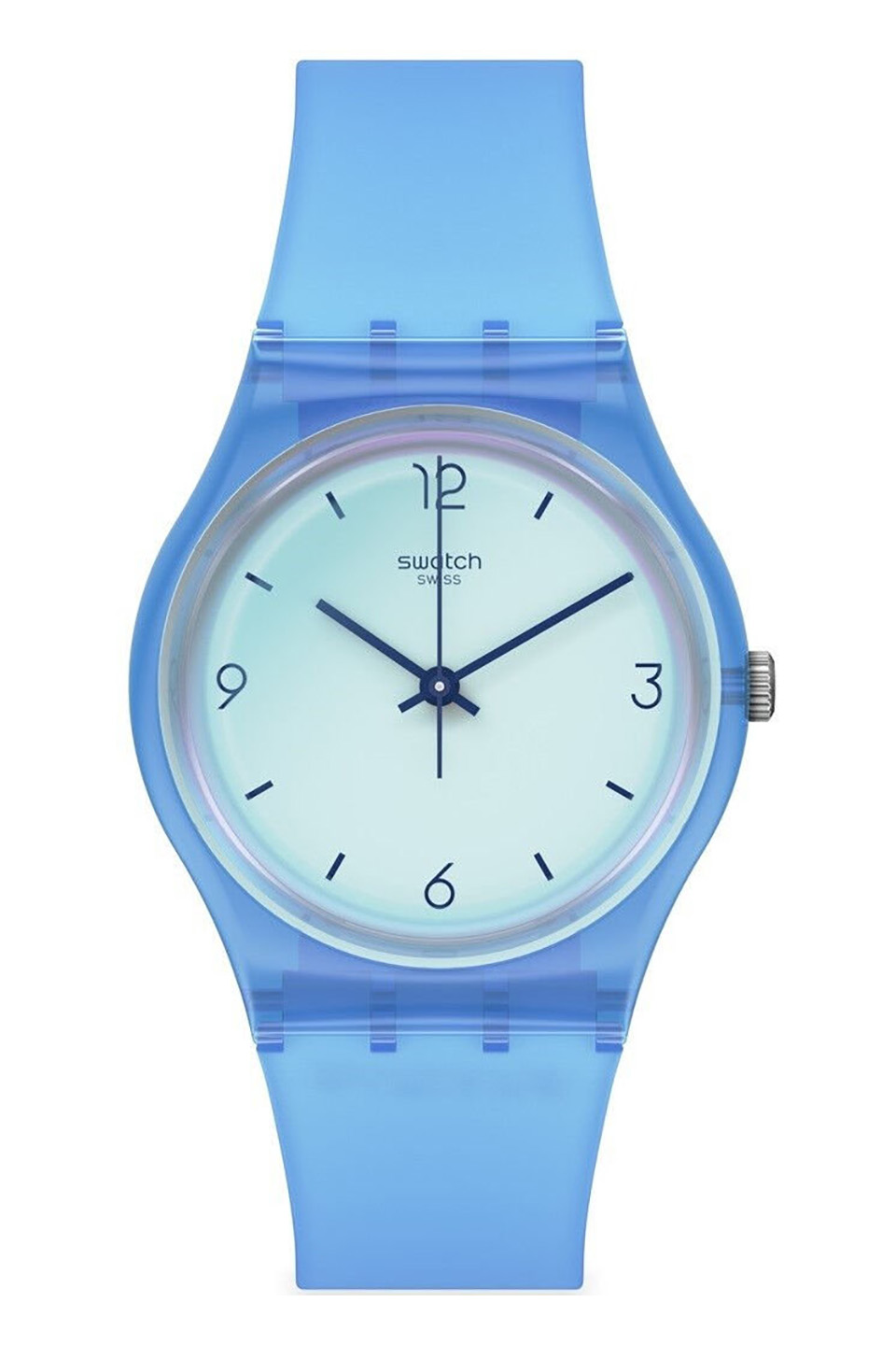 Díky sklu Swatch Solar Spectrum, které vytváří zrcadlový efekt, tyto hodinky Gent snadno upoutají pozornost. Bílý ciferník s modrým potiskem vyniká na pozadí průhledného lesklého modrého polymerového pouzdra, silikonového řemínku, poloprůhledného matného modrého silikonového řemínku a smyčky s lesklou modrou polymerovou sponou.