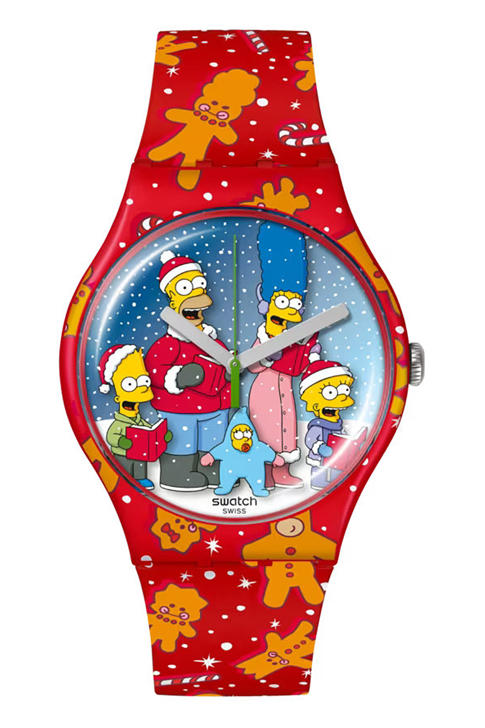 Tento slavnostní červený model Simpsons Holiday Special, který je součástí kolekce Simpsons Collaboration Collection, má vícebarevný potištěný číselník s vyobrazením všech členů rodiny Simpsonových. Červený potištěný řemínek má kontrastní modrou smyčku a sponu. TM & © 20th Television. Matt Groening