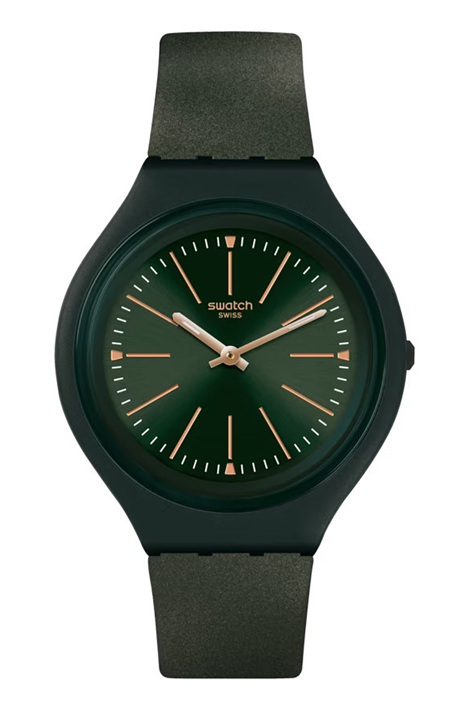 SKINCAPPERO (SVUG100) s kovovým tmavě zeleným řemínkem, smyčkou a sponou – vše s efektem Anodamazing – si nemůžete nechat ujít. Sluncem broušený zelený ciferník má růžově zlaté aplikace Swatch.