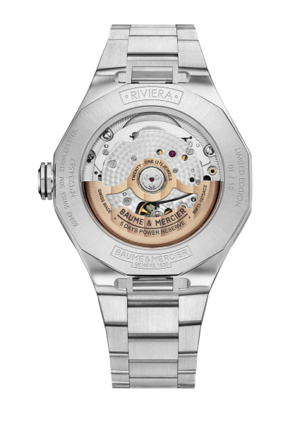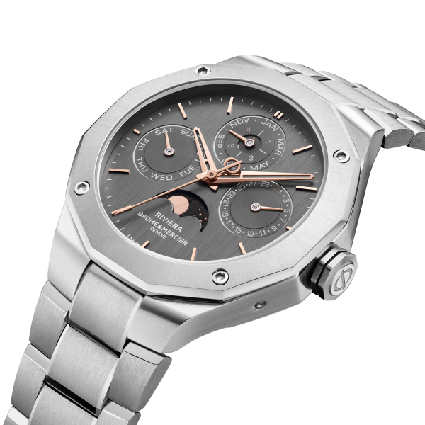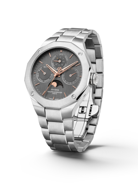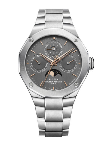 Hodinky Riviera jsou v této verzi vybavené věčným kalendářem. Výrobní komplikace – která je charakteristickým znakem značky Baume & Mercier a je pravidelnou součástí modelu Clifton – byla do kolekce Riviera zavedena v roce 2023 k jejímu 50. výročí v modelu z oceli o průměru 40 mm vyrobeném v limitované edici pouhých 50 hodinek. Na základě zářivého úspěchu této edice je letos hodinářská odbornost těchto ikonických hodinek dále posílená. Technický úspěch je uzavřený ve dvanáctihranném pouzdře o průměru 40 mm a tloušťce pouhých 11,8 mm. Pouzdro z ušlechtilé oceli s leštěnou saténovou úpravou je chráněné safírovým sklíčkem odolným proti poškrábání s oboustrannou antireflexní vrstvou. Luneta, připevněná čtyřmi šrouby, je vyrobená z leštěné ušlechtilé oceli se saténovou povrchovou úpravou. Zadní strana pouzdra je krytá safírovým sklíčkem a upevněná čtyřmi ocelovými šrouby. Osmihranná korunka je ovinutá černým obrysem. Uprostřed se nachází emblém značky, logo Phi.