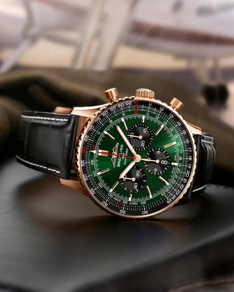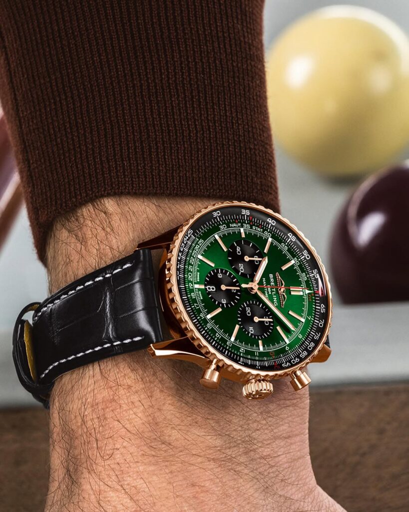 Na první pohled je jasné, že sledujeme Navitimer. Typický „číselník“ plný detailů, kontrastní subčíselníky a ikonické pravítko na lunetě tvoří vizuální DNA modelu.