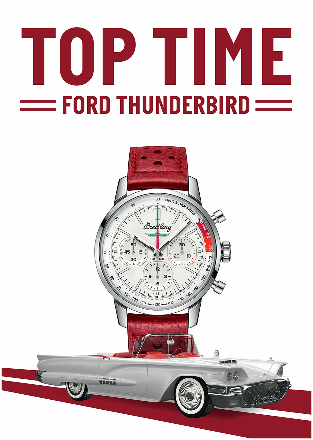 „Hodinky Top Time představovaly odklon od tradičního designu hodinek pro generaci, která ve všech ohledech porušovala konvence,“ říká generální ředitel společnosti Breitling Georges Kern. „S kolekcí Top Time Classic Cars inspirovanou šedesátými lety minulého století jdeme za tímto pocitem svobody a zábavy a jsme nadšeni, že můžeme opět spolupracovat se společností Ford a představit nový model Thunderbird spolu s aktualizovanými verzemi chronografů Ford Mustang, Chevrolet Corvette a Shelby Cobra.“