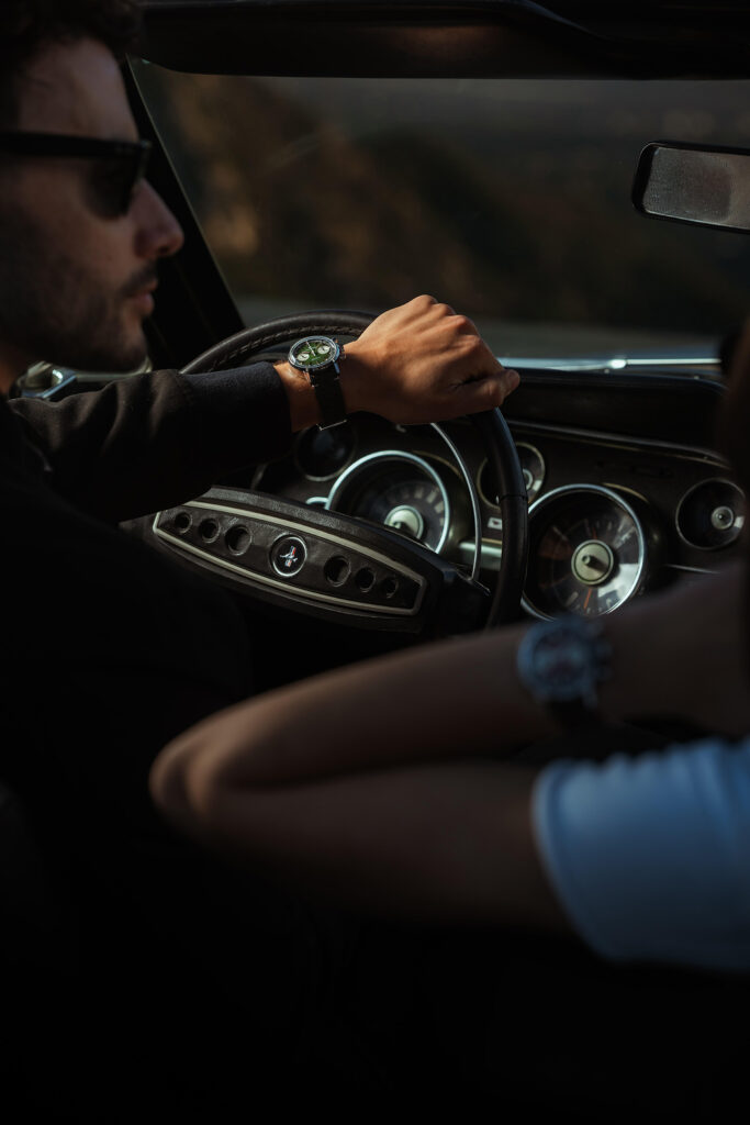 Design novinek je postavený na kontrastech a barvách, které byly pro motorsport té doby typické. Dvě verze s kouřovým gradientním číselníkem v odstínech Hunter Green a teplé hnědé přecházejí od tmavých okrajů ke světlejšímu středu a elegantně zvýrazňují klenutý tvar pouzdra. Třetí varianta s modro-oranžovou kombinací je nejodvážnější – jasný odkaz na závodní laky a týmové barvy minulých dekád.