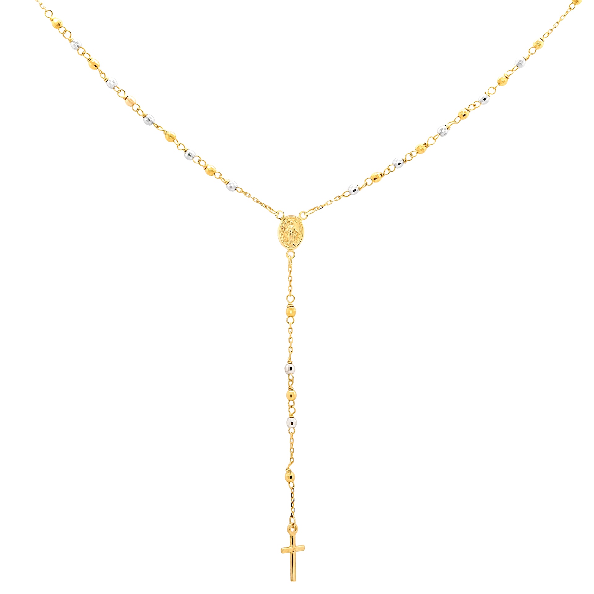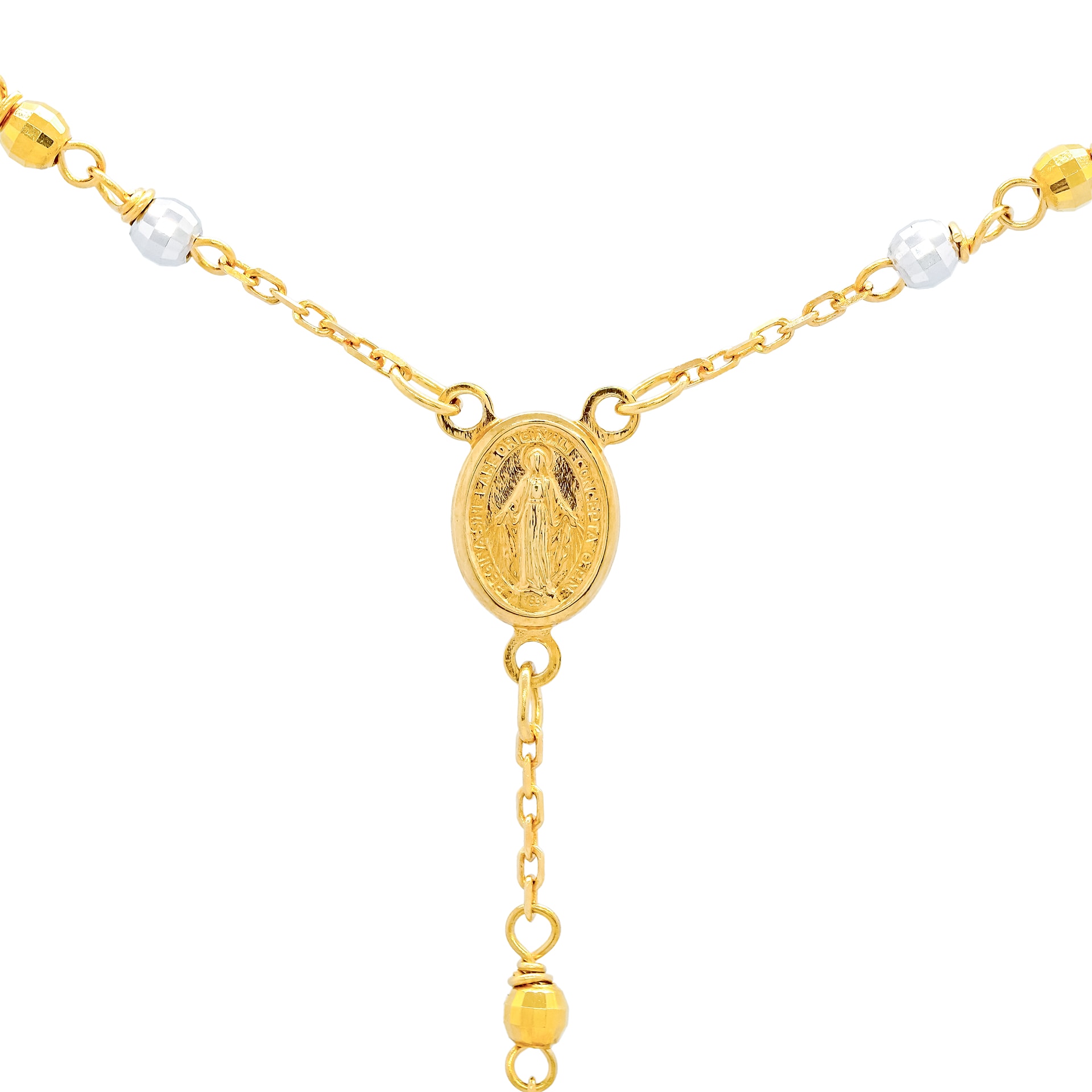 Náhrdelník ze žlutého zlata - růženec s křížem a Pannou MariíHmotnost šperku 4,75 gRyzost zlata 585/1000