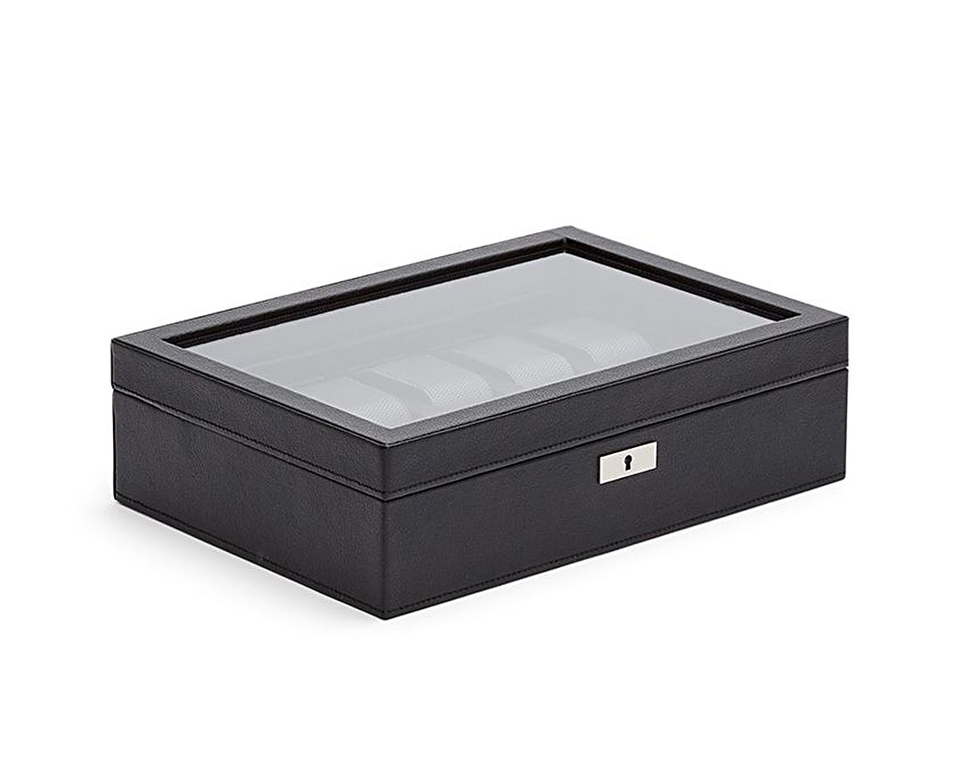 Moderní klasika a elegance, to je luxusní box značky Wolf. Pro Vaše hodinky se stane skvělým úložištěm. Svou kolekci tak můžete mít vystavenou na očích a těšit se i pouhým pohledem. Povrch je z kvalitní veganské kůže, zámek na klíč z chromu. Podšívka má hedvábnou stříbrnou texturu. Součástí je také chytrý USB vstup.