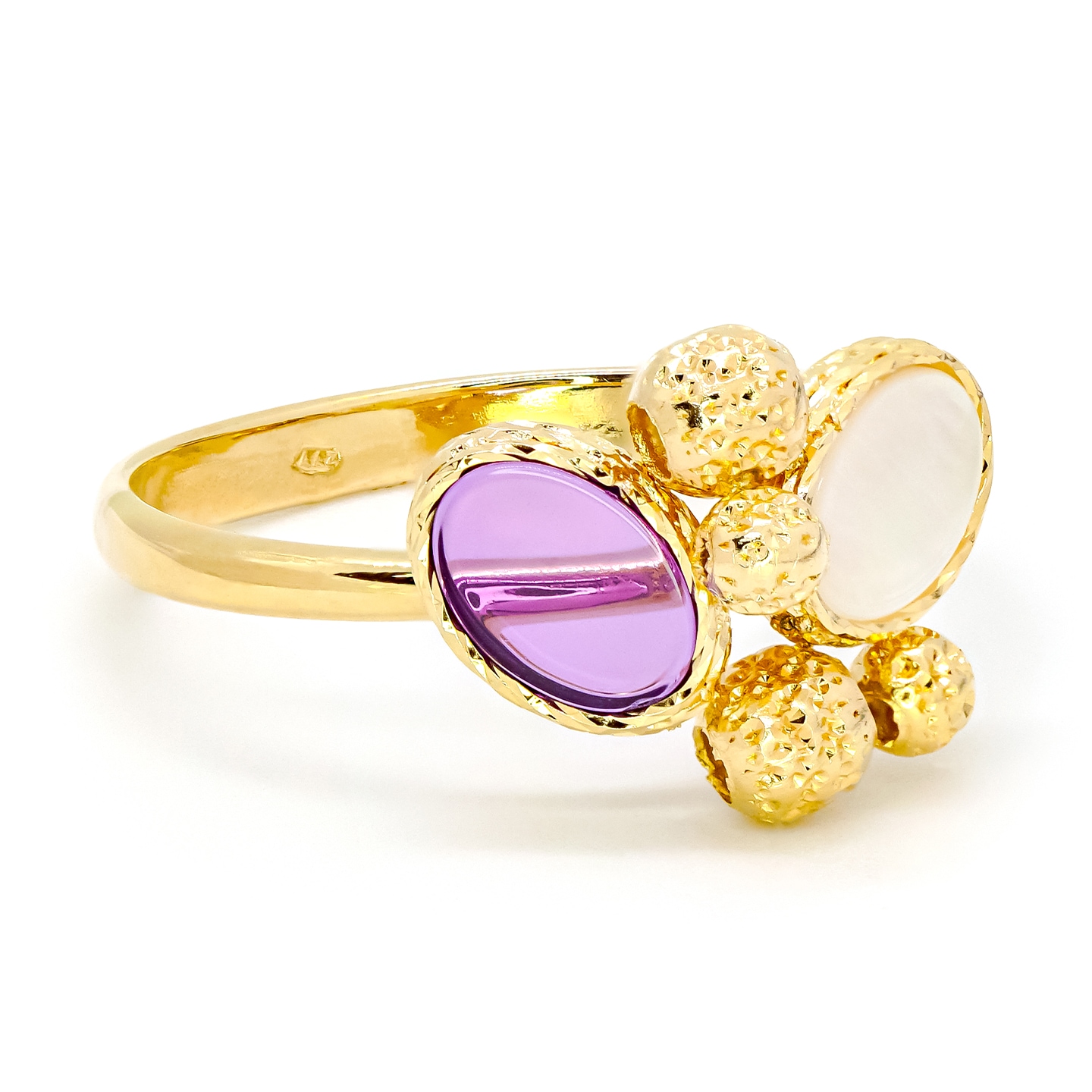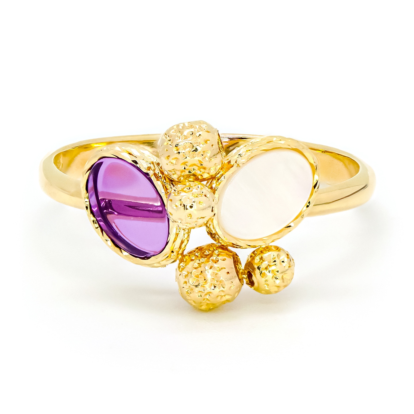 Prsten ze žlutého zlata s fialovým kamenem a syntetickým opálemHmotnost šperku 2,70 gRyzost zlata 585/1000
