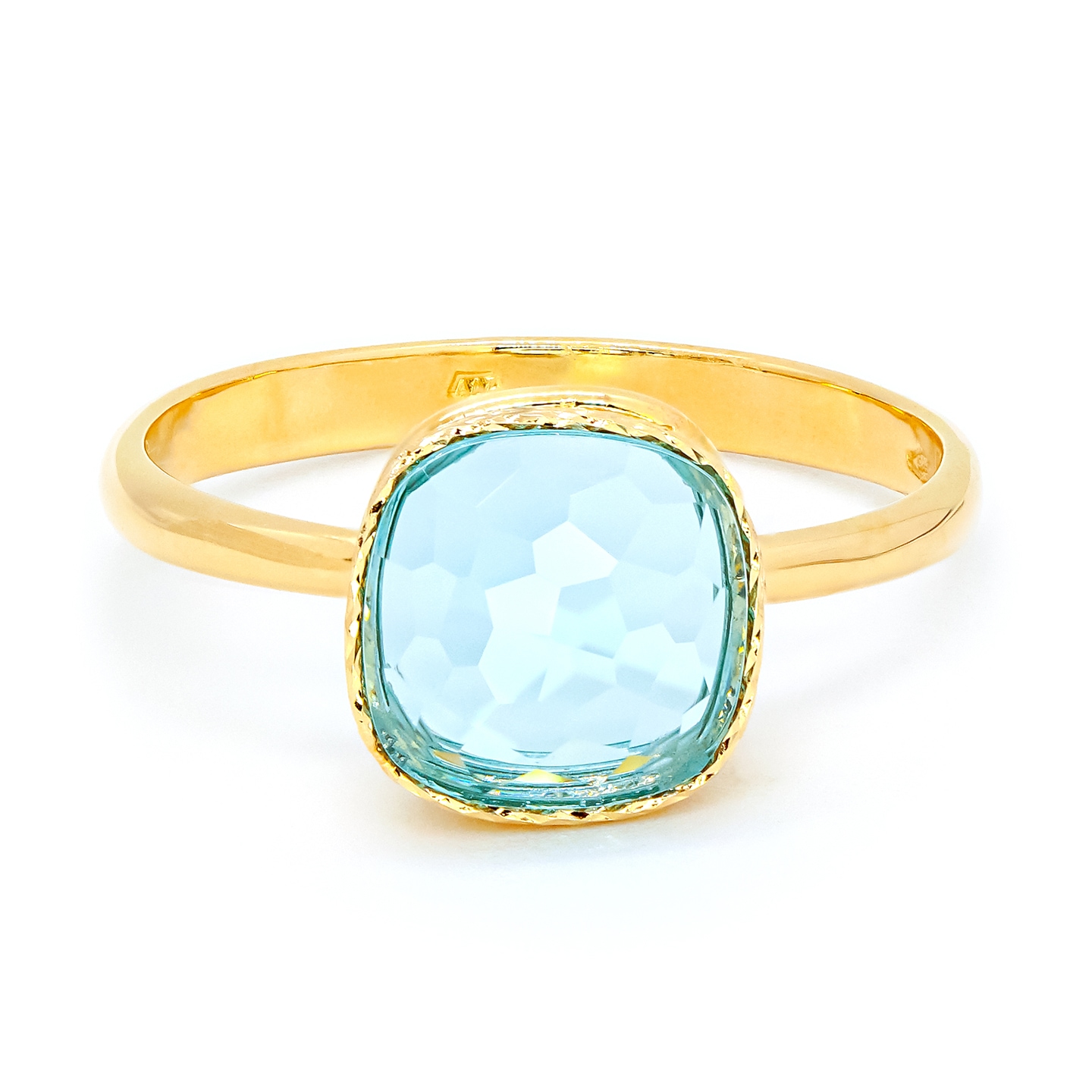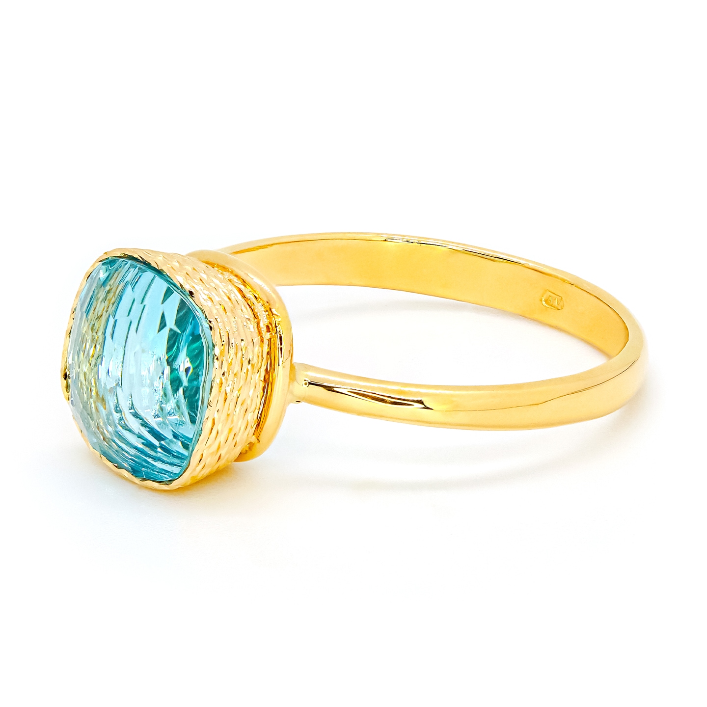 Prsten ze žlutého zlata se světle modrým kamenemHmotnost šperku 2,90 gRyzost zlata 585/1000